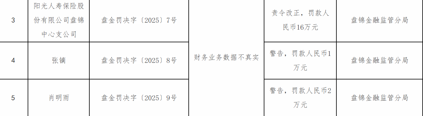 12月25日,盘锦金融监管分局行政处罚信息公示列表显示,阳光人寿保险股份有限公司盘锦中心支公司因财务业务数据不真实被罚款人民币16万元;张某被警告并罚款人民币1万元;肖某雨被警告并罚款人民币2万元。