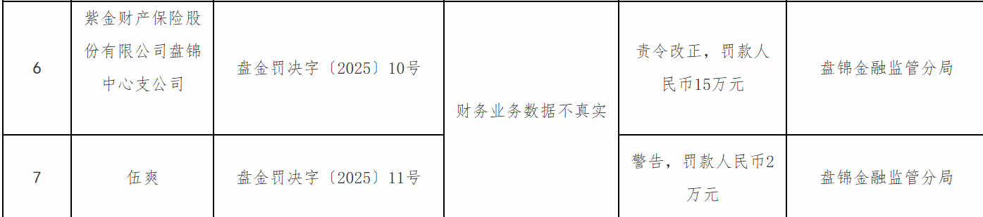 12月25日,盘锦金融监管分局行政处罚信息公示列表显示,紫金财产保险股份有限公司盘锦中心支公司因财务业务数据不真实被罚款人民币15万元;伍某被警告并罚款人民币2万元。